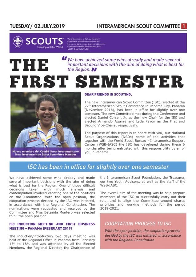 The purpose of this report is to share with you, our National Scout Organizations (NSOs) some of the activities that together with the World Scout Bureau – Interamerica Support Center (WSB-IASC) the ISC has developed during these 6 months after being entrusted with this responsibility by all of you in Panama.